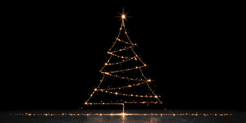 A minimal outline of a Christmas tree with subtle golden lights on black background.