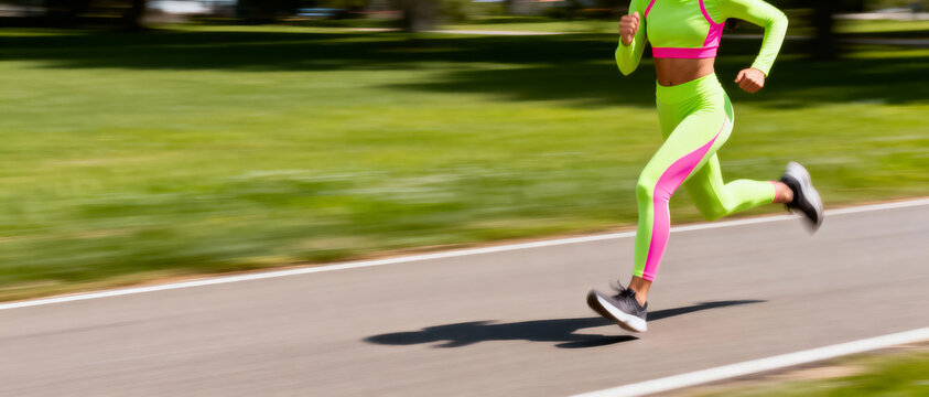 Female athlete in bright neon lime green and pink sportswear running on asphalt track against green park background with motion blur effect.