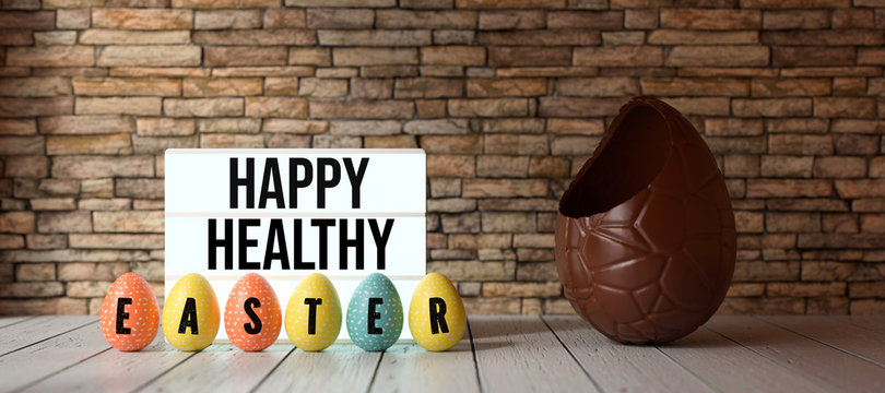 easter eggs with message HAPPY HEALTHY EASTER with big chocolate egg in front of a brick wall