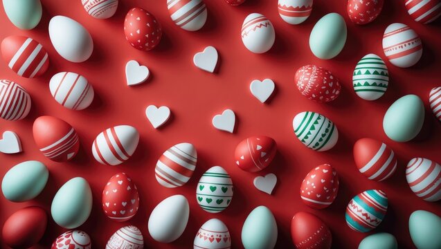 Bright red backdrop with scattered red and white Easter eggs, flat lay top view with copy space