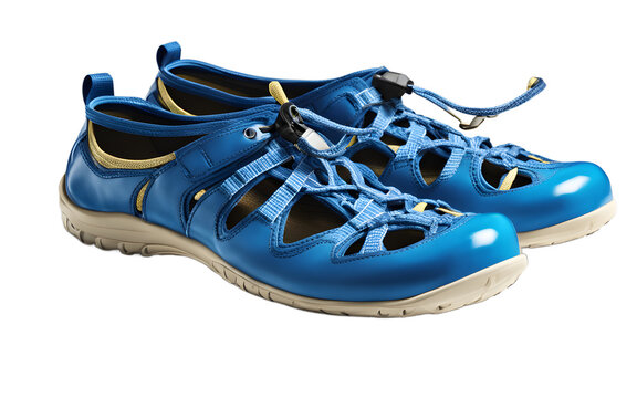 A pair of comfortable water shoes in bright blue, isolated on a empty plain background