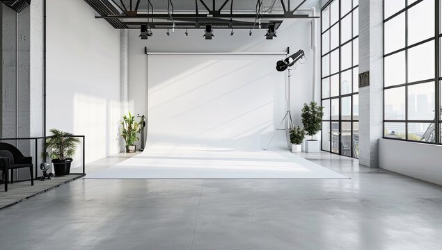 A large and white simple photo studio with lights, film studio with technical equipment. Creative workshop of the photographer.