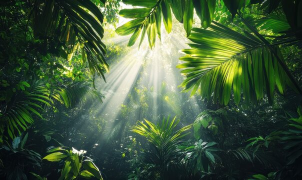 Natural, beautiful nature images sunlight streaming through the canopy of tall trees in a dense forest with vibrant green foliage view from below