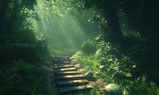 Serene nature trail with wooden steps winding through a lush green forest, softly lit by sunlight streaming through the dense canopy above