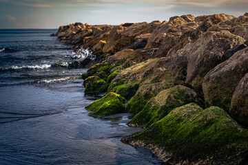 Detalle de un rompeolas de grandes rocas cubiertas de algas y musgo verde, con pequeñas olas rompiendo suavemente bajo la luz cálida del atardecer en la costa mediterránea