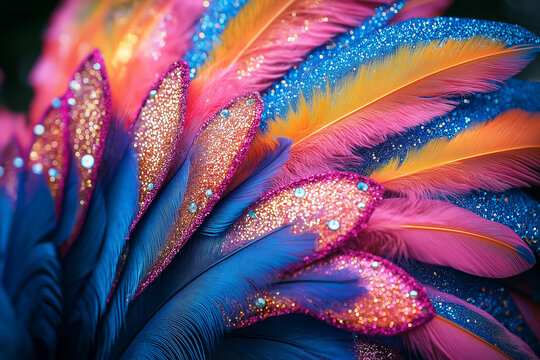 Photo de détails de plumes colorées pour costumes de carnaval, vêtement, déguisement, habit, pailletées, strass
