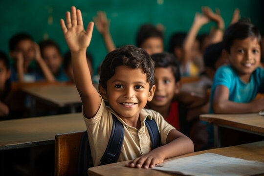 Asian primary schoolboy raise hand to answer a question during class in the classroom. Back to school concept. Generative AI.