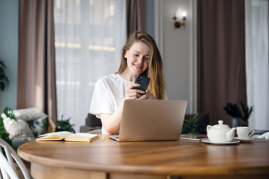 Woman online shopping on the store's website via the Internet. The freelancer uses a laptop and a phone, a computer on the table.