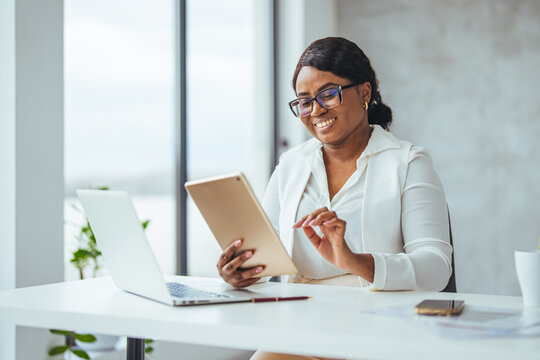 Shot of a businesswoman using a digital tablet at her desk in a modern office. Cropped shot of a businesswoman using a laptop and digital tablet at her desk in a home office.