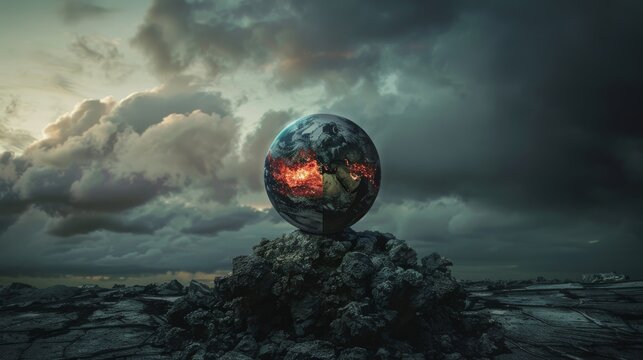 A fiery globe balances on a rocky pedestal under ominous skies, symbolizing a world on the brink of chaos and destruction.