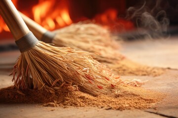 Natural-fiber brush sweeping fine sawdust from wooden bench close-up