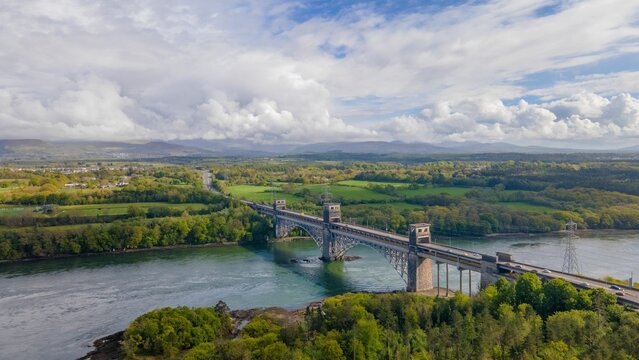 Aerial view of Pont Britannia Bridge across Menai Strait in Pentir, United Kingdom