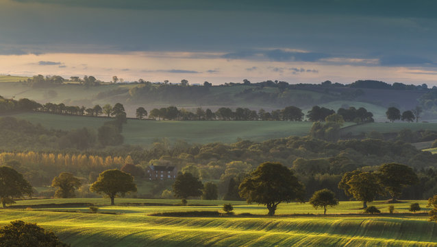 Sunset over fields in Berry Pomeroy Village, Devon, England, Europe