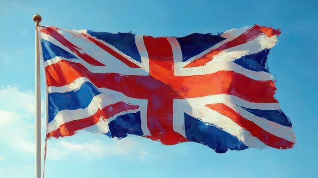 weathered british flag waving proudly on a tall pole against a clear blue sky