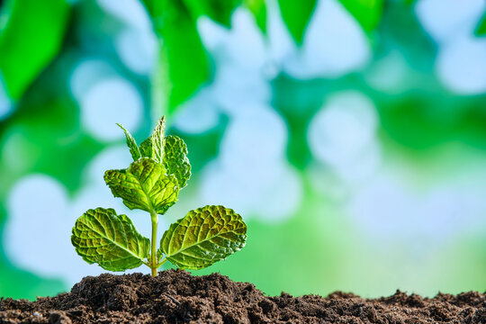 green sprout with broad lobed leaves growing out of the ground with defocused background
