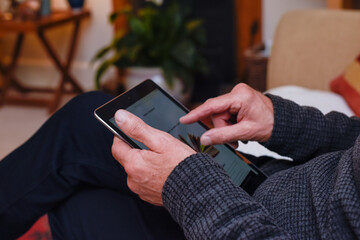 Senior man using tablet device on internet connected by home wifi he is sitting on a sofa