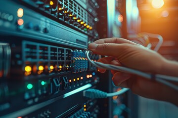 Abstract digital network background with glowing connections and nodes in orange and blue colors. Big data technology concept