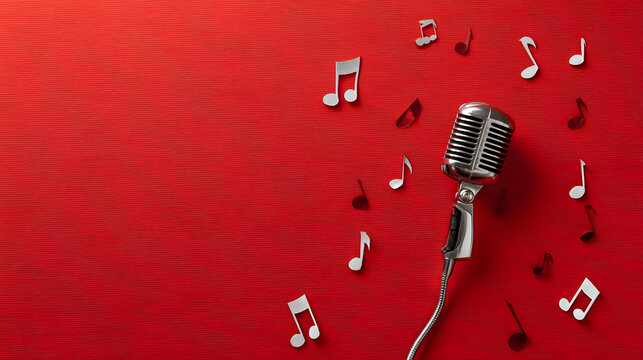Retro microphone with coiled cable on red background with musical notes for vintage music design