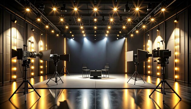 A studio setup with cameras and lights for a broadcast or production.