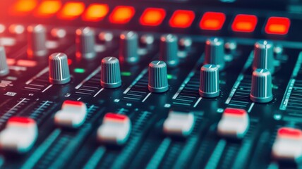 Close-up of a modern digital audio mixer with colorful buttons and backlighting in a studio setting, creating a vibrant atmosphere.