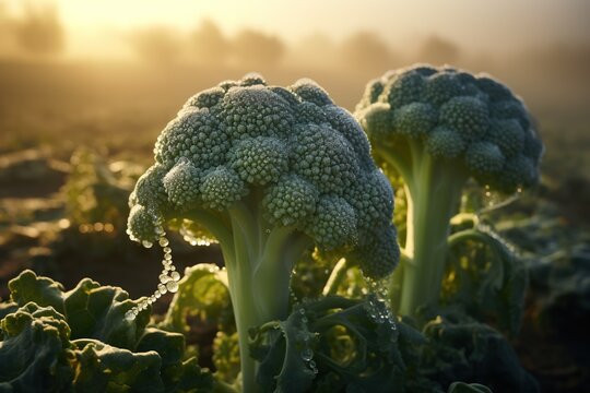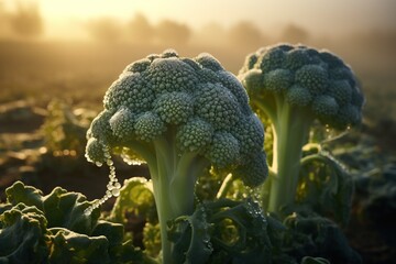 Dew-kissed broccoli crowns at sunrise