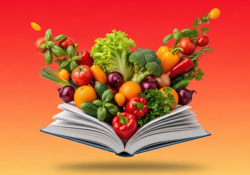 Fresh Produce on Open Book Featuring Colorful Vegetables and Fruits Overlays