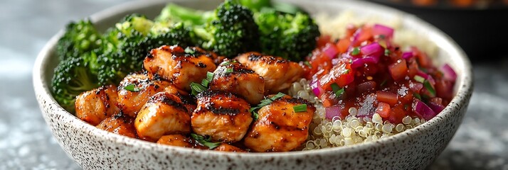 Seared salmon fillet with colorful vegetables in yellow bowl for healthy gourmet dinner