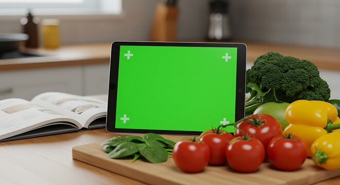 Woman wearing apron uses tablet while preparing healthy meal in kitchen