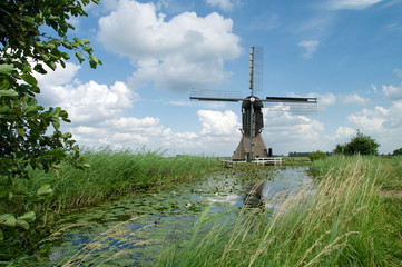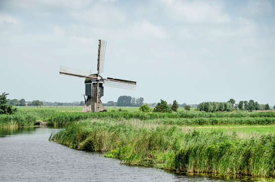 Streefkerk, The Netherlands, July 18, 2021: nature reserve Donkse Laagten with a reeds-lined canal and the 16th century Broekmolen windmill