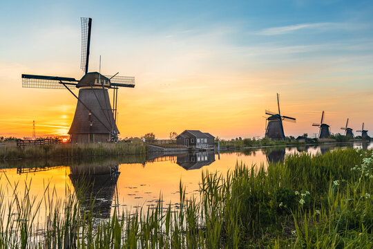 Dutch landscape, windmills at Kinderdijk village, a famous authentic attraction in the Netherlands.