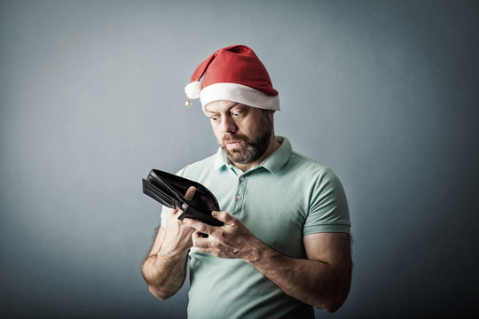 bearded middle-aged man in a santa hat sad, upset, unemployed broke guy, fired employee, holding looking into his empty wallet,  on a blue background