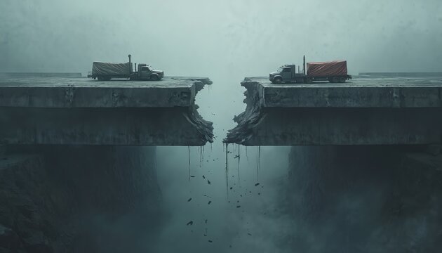 Two trucks stand on edges of broken bridge over abyss. Concrete pieces fall down representing economical sanctions, trade war disruption, import export collapse, crisis. International relations