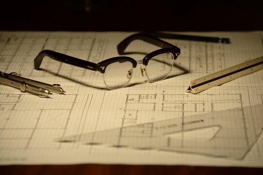 夜に自宅で建築の設計製図の作業風景(休憩中) A scene of architectural drafting work at home at night (during a break)