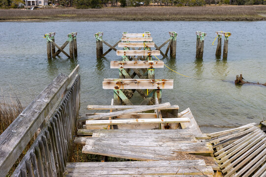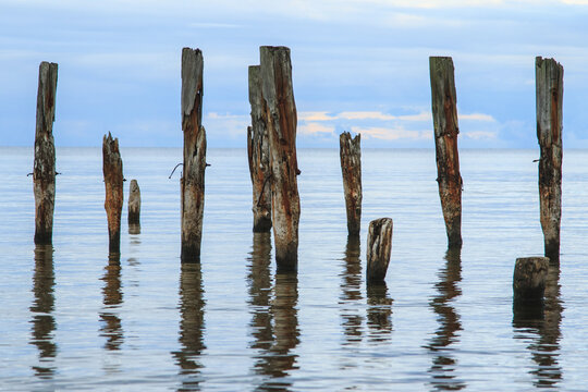Abandoned and broken dock for swimmers, at Emerald Lake in Canada, taken at dusk