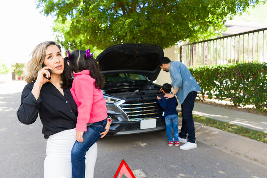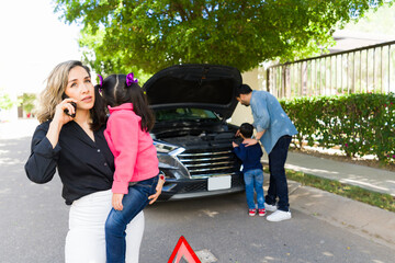 Young woman opening bonnet of broken down car having trouble with her vehicle. Worried woman talking on the phone near broken car. Girl model standing near the broken car calling for auto service