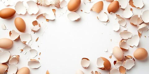 Shattered eggshells scattered on a white background with brown and white shells positioned around empty central space creating selective focus effect