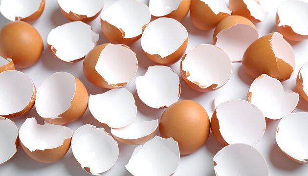 Scattered broken eggshells on white