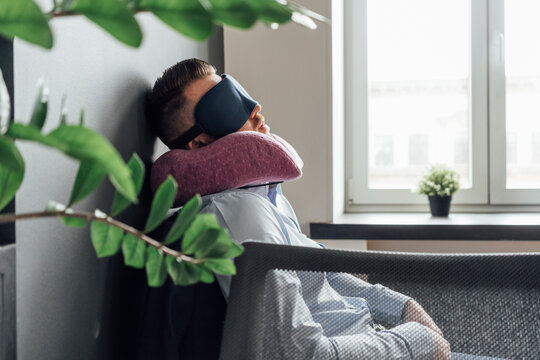 Exhausted businessman with eye mask and neck pillow sleeping in office