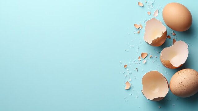 Freshly cracked eggs with shells on a blue background