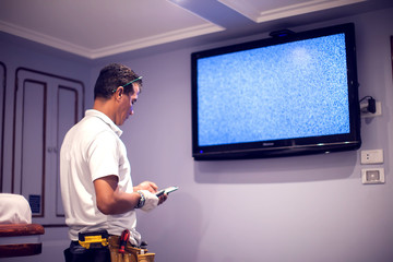 Man trying to fix broken tv
