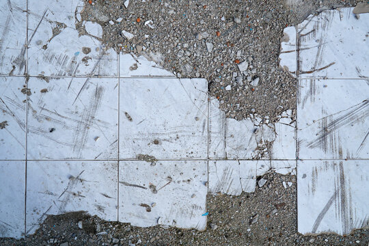 Ceramic tiles floor cracked and broken from concrete inflate in house or office building. Floor cracked in house problem renovation and repair concept.