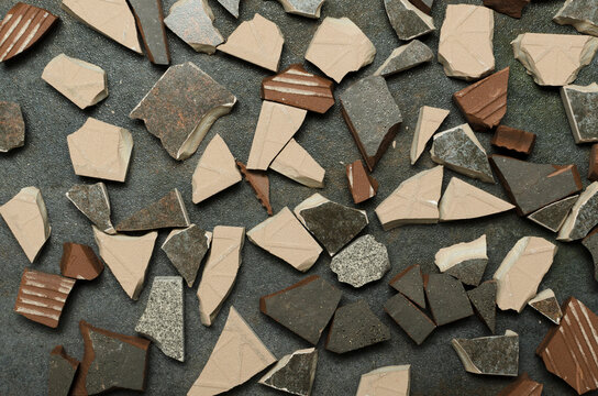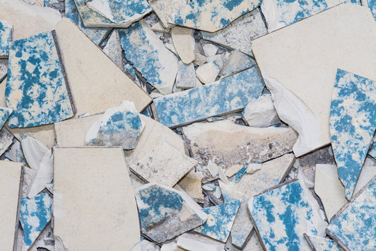 Broken tiles from demolition of an old flooring. Texture of worn retro floor pieces. Ceramic shards close-up as background. Idea of renovation and modernization of tiling and housing.