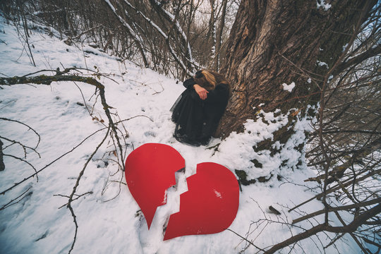 Depressed and brokenhearted woman leaning on tree in forest in winter.