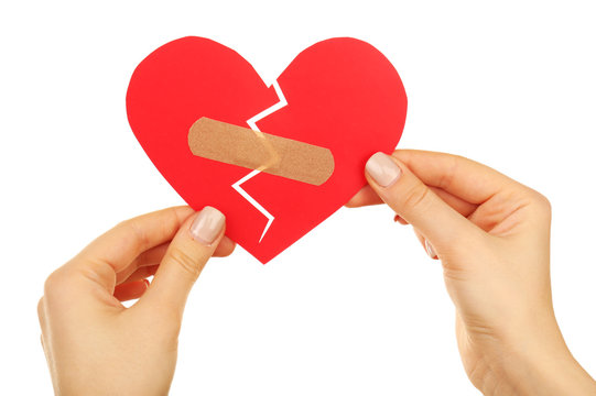 Female hands holding broken heart with plaster isolated on white