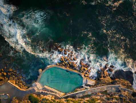 Aerial drone view of Bronte Ocean Pool in Sydney during sunrise in soft early morning light, New South Wales Australia