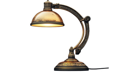 Ornate brass oil lamp, engraved spout and handle, warm metallic sheen, isolated on white background