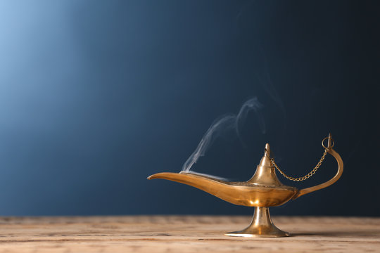 Antique Aladdin arabian nights genie style oil lamp with soft light white smoke, Dark background.