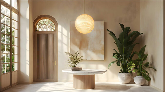 3D rendering of a modern entryway with a table and a hanging mirror lamp in the style of light bronze light beige and gold The walls have large windows on one side