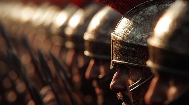 A focused shot of several soldiers wearing bronze helmets with red plumes, ready for combat, representing unity, order, and determination in an ancient battle scenario.