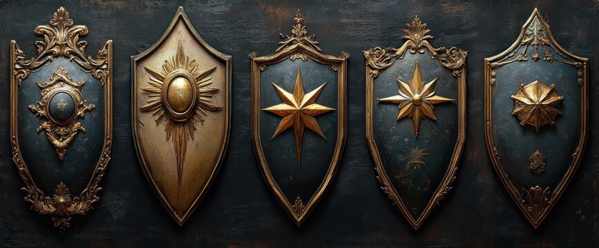 Fantasy Game UI Design with Ornate Shields, Gold and Silver Frames, Starlit Badges, and Baroque Elements